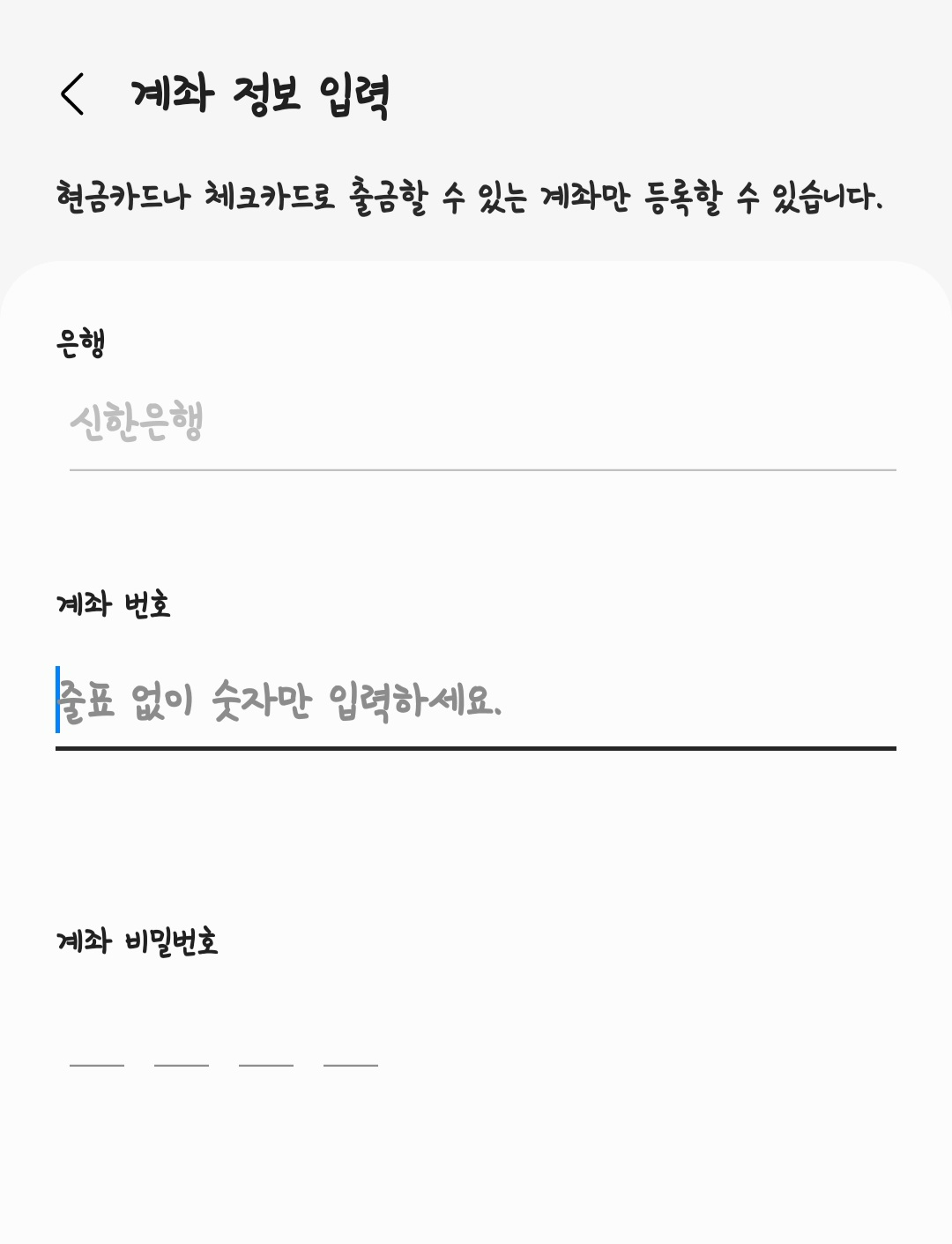 삼성페이에 계좌를 등록해야한다는 것이다.