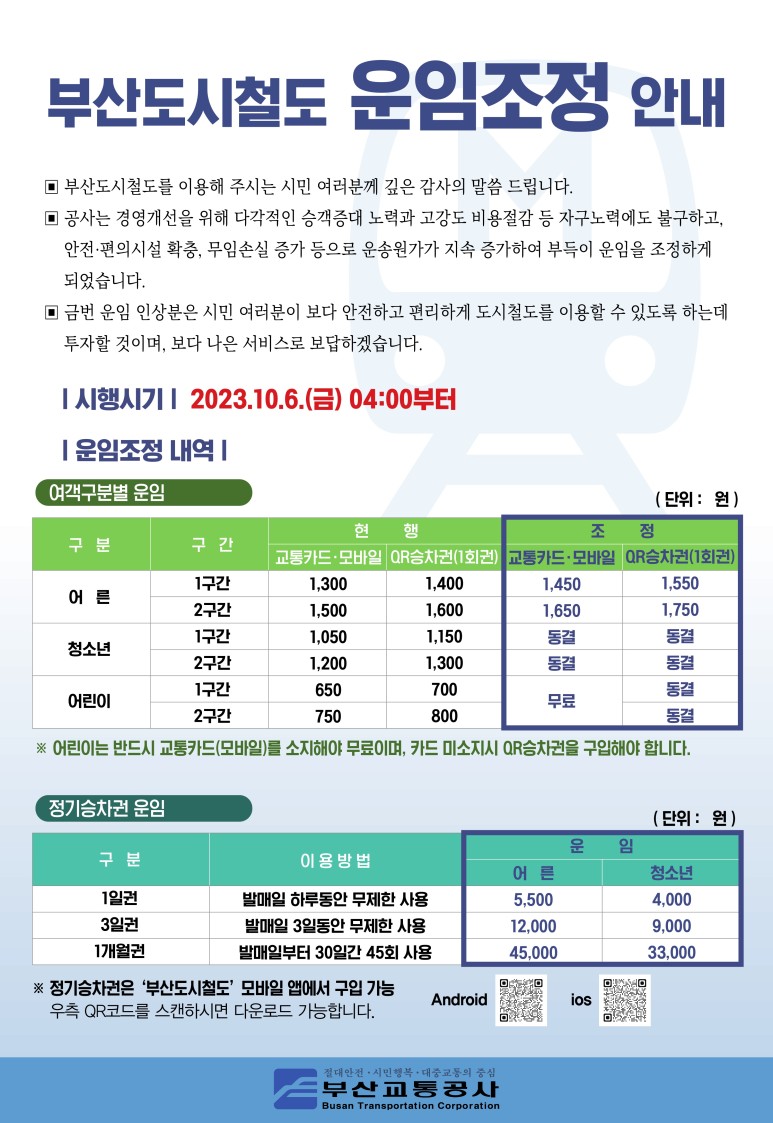 청소년요금 동결, 어린이 무료