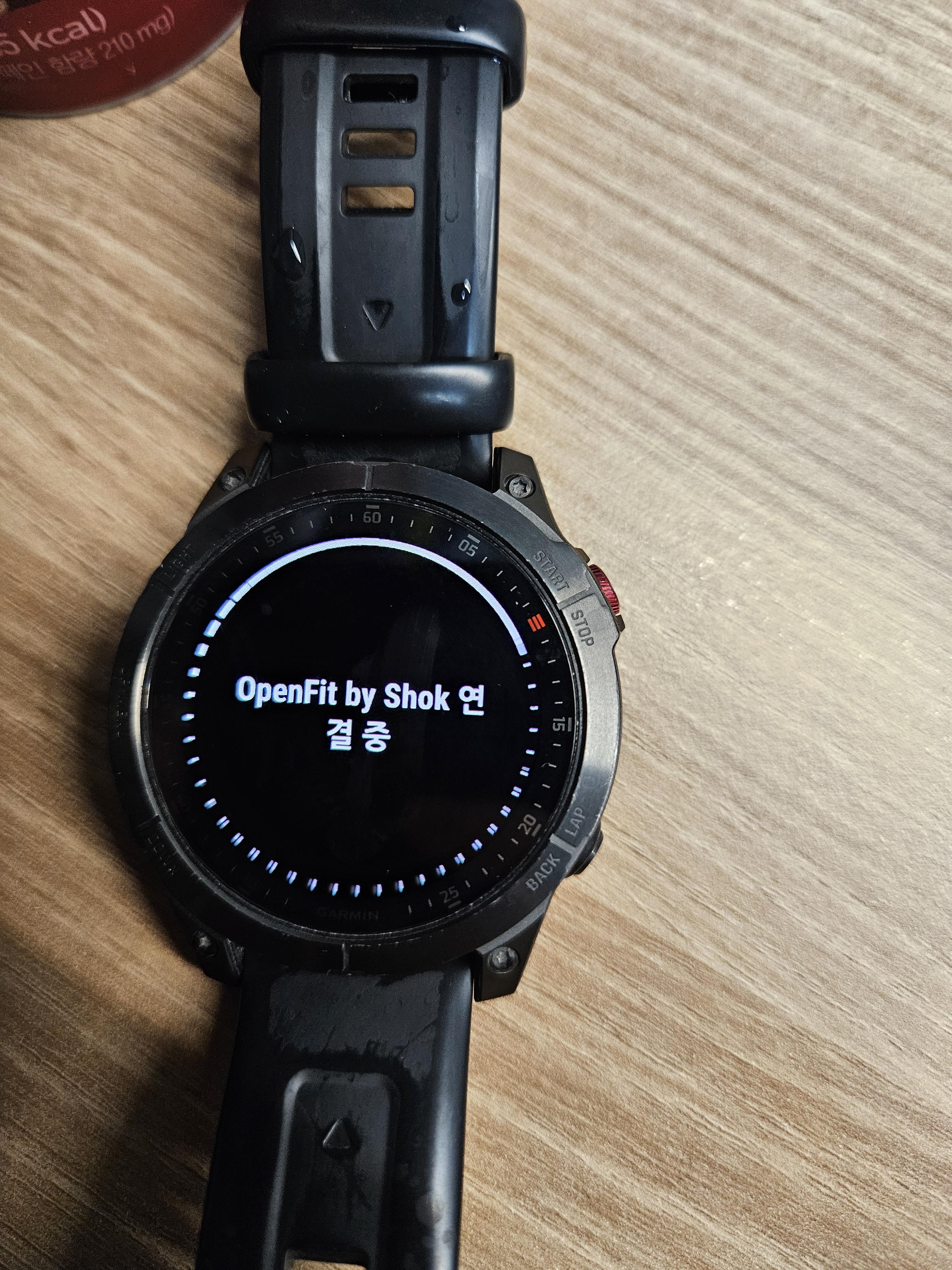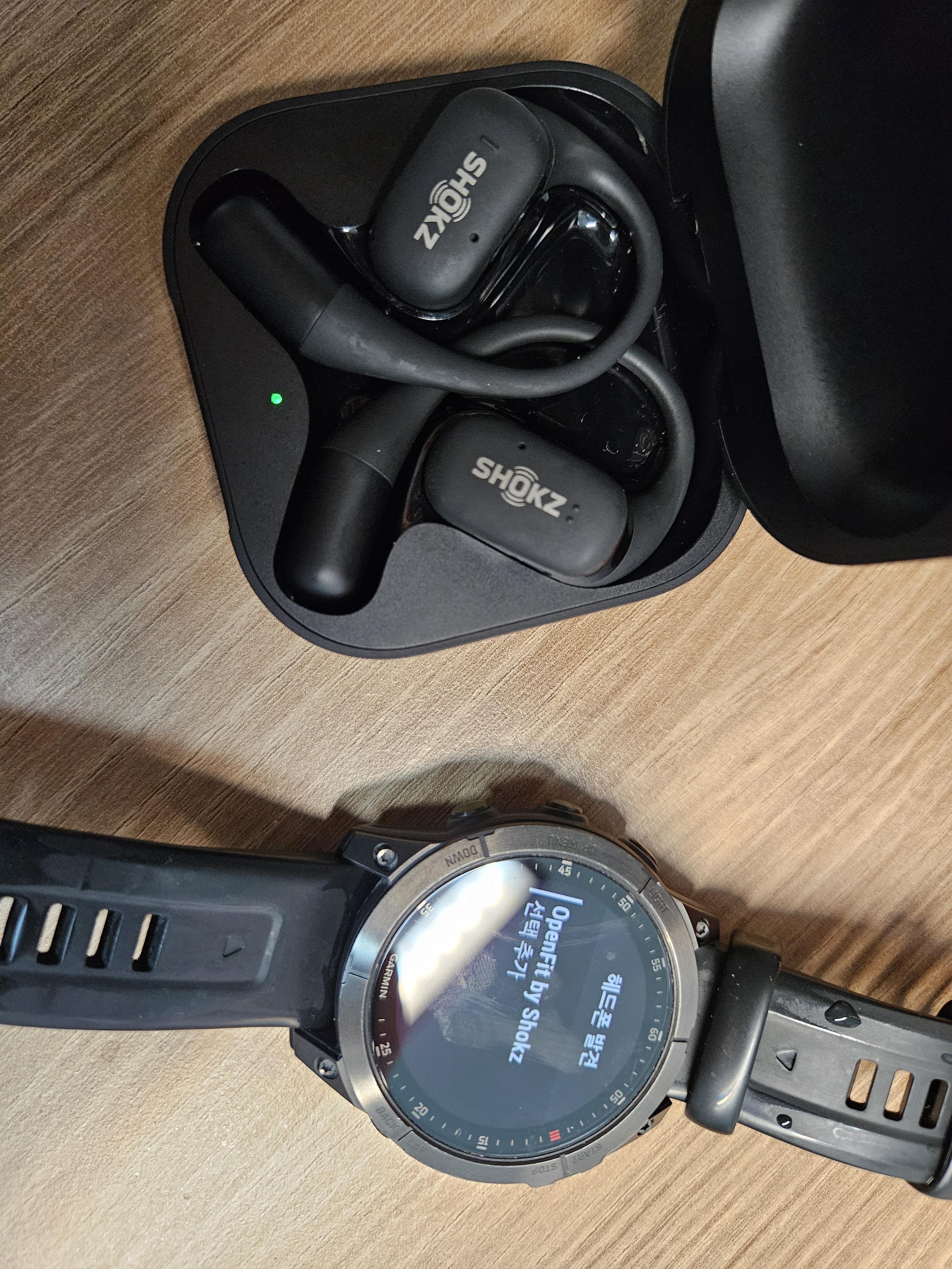 그럼 저렇게 오픈핏 바이 샥즈라고 뜰 것인데가민시계에서 터치한 후오픈핏 바이 샥즈 연결 중이라는 화면이 뜨면이어폰을 꺼내면 바로 연결 완료가 된다.