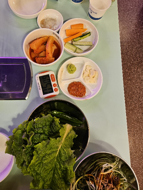 첫 밑반찬은 쌈, 파무침,당근,오이 쌈장 등이 나온다.