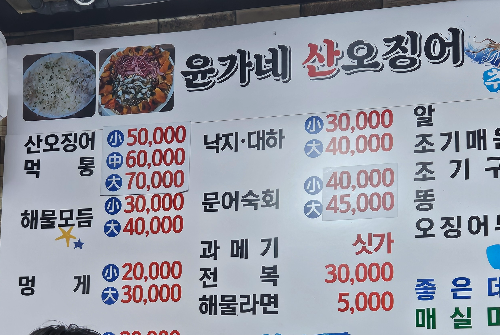 윤가네 산 오징어 가격은 소중대로 구성이 되어있고 우리가 갔던 시기에는 갑오징어만 판매를 할 수 있는 시즌이였고 일반 오징어는 안타깝지만 오징어를 잡지 못하는 시기라고 한다.