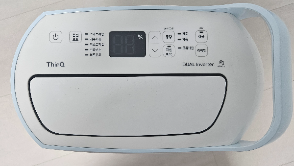 LG 제습기의 전반적인 모습이다. 전원버튼과 스마트제습, 쾌속제습, 의류 건조 등 운전모드를 조절할 수가 있고
