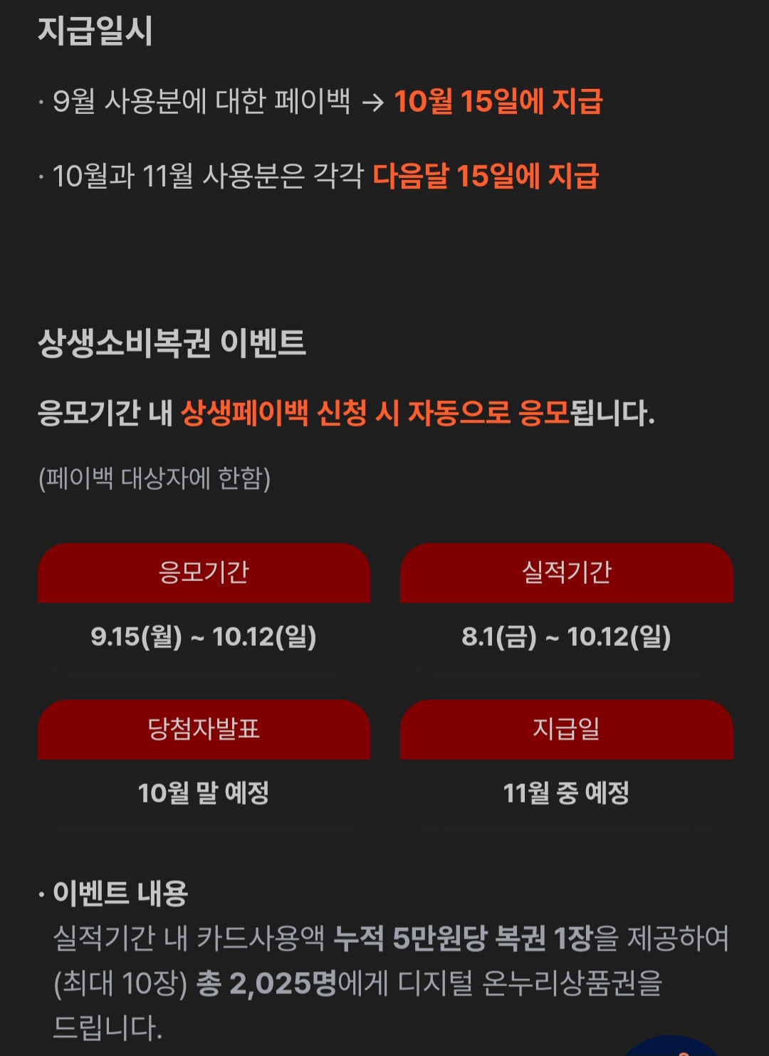 상생페이백이란 2024년 월 평균 카드소비액보다 올해 9월에서 11월까지 늘어난 월별 카드소비액의 20%를 돌려주는 사업인데