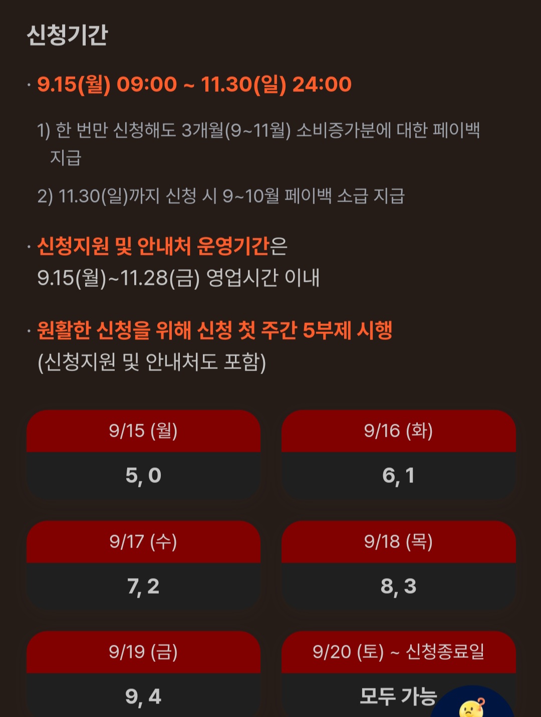 9월 15일부터 9월 19일까지는 원활한 신청을 위해 5부제를 시행하지만